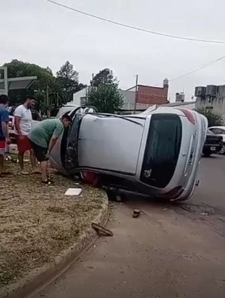 Como dice el informe policial: "Por causas que se tratan de establecer" un Peugeot 206, quedó volcado sobre uno de sus laterales tras impactar con una camioneta Chevrolet S.10, blanca, quedó volcada en la calle Concejal Veiga y Mario Gatto alrededor del mediodía de este 1 de enero.
