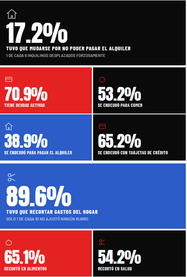 La radiografía se vuelve más cruda cuando se observa el destino de ese endeudamiento. Más de la mitad de los inquilinos (53,2%) tomó deuda para poder comer, mientras que el 38,9% lo hizo específicamente para pagar el alquiler. Las tarjetas de crédito aparecen como principal herramienta de financiamiento: el 65,2% recurrió a ellas para cubrir gastos básicos.